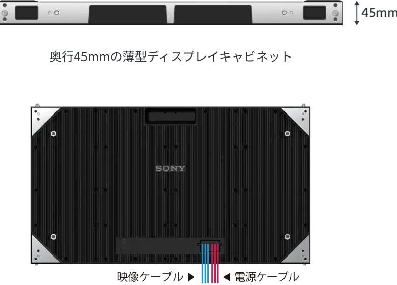 奥行45mmの薄型ディスプレイキャビネットにより、壁設置時の背面スペースを縮小可能。また、必要に応じて開けられる背面の穴を使って配線をすっきり整理でき、1.25mmピッチ108インチ、1.56mmピッチ135インチの構成では、電源ケーブルとRJ45ケーブルをすべて最下段から配線可能です。
