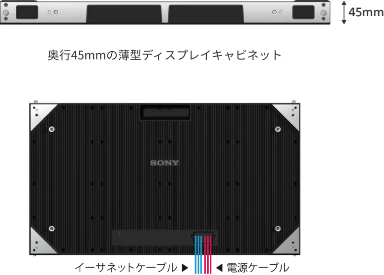 奥行45mmの薄型ディスプレイキャビネットにより、壁設置時の背面スペースを縮小可能。また、必要に応じて開けられる背面の穴を使って配線をすっきり整理でき、1.25mmピッチ108インチ、1.56mmピッチ135インチの構成では、電源ケーブルとイーサネットケーブルをすべて最下段から配線可能です。