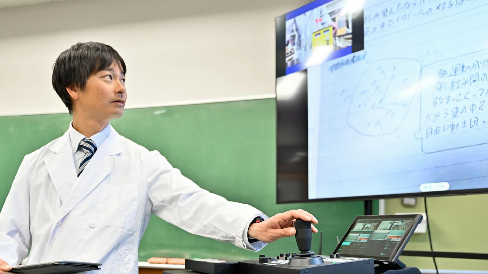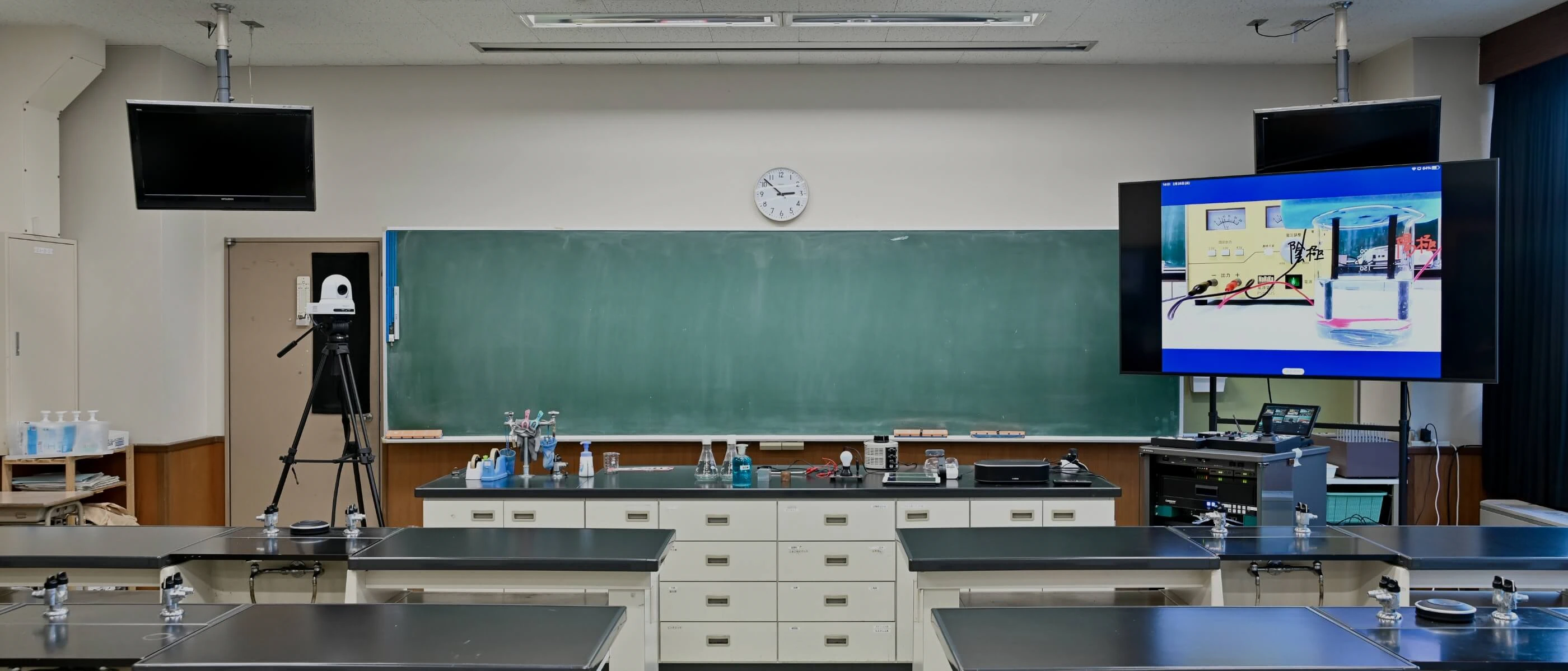 金子教諭「きっかけは、コロナ禍での出席停止等の生徒に対しての学習支援のために、授業の配信を始めたことでした。固定したiPad1台で行う授業配信では、配信先の生徒には授業の見たい部分が上手く見られていないのではないかと感じていました。そこで、私が担当する理科の授業を行う物理化学室では、スイッチャーを使って画面を切り替えたり、分割したりしながら、教室のディスプレイに映している画像やハンディカメラで写した教室の様子を配信する取り組みを始めました。配信した授業の映像は同時に録画されて残るので、この授業の記録も利活用できるのではないかと考えたのです。はじめは、授業をしながらハンディカメラを手動で動かして黒板や実験の手元、発表する生徒の様子を撮影していましたが、授業者が授業そのものに専念できる形にしたいと以前から考えていました。
