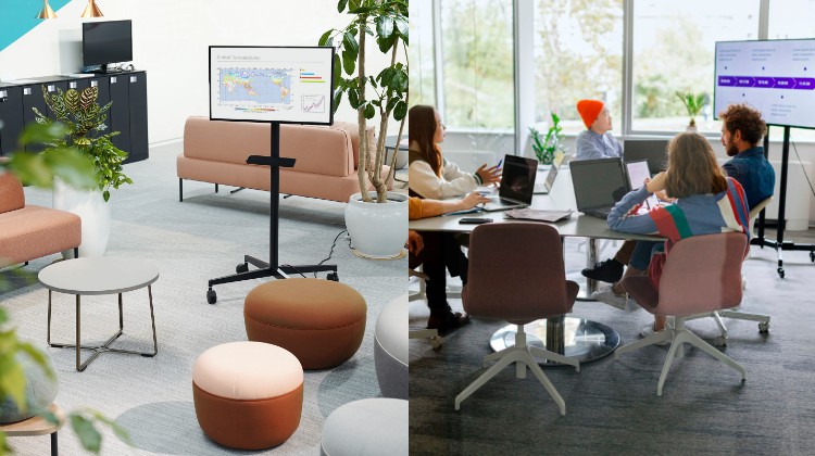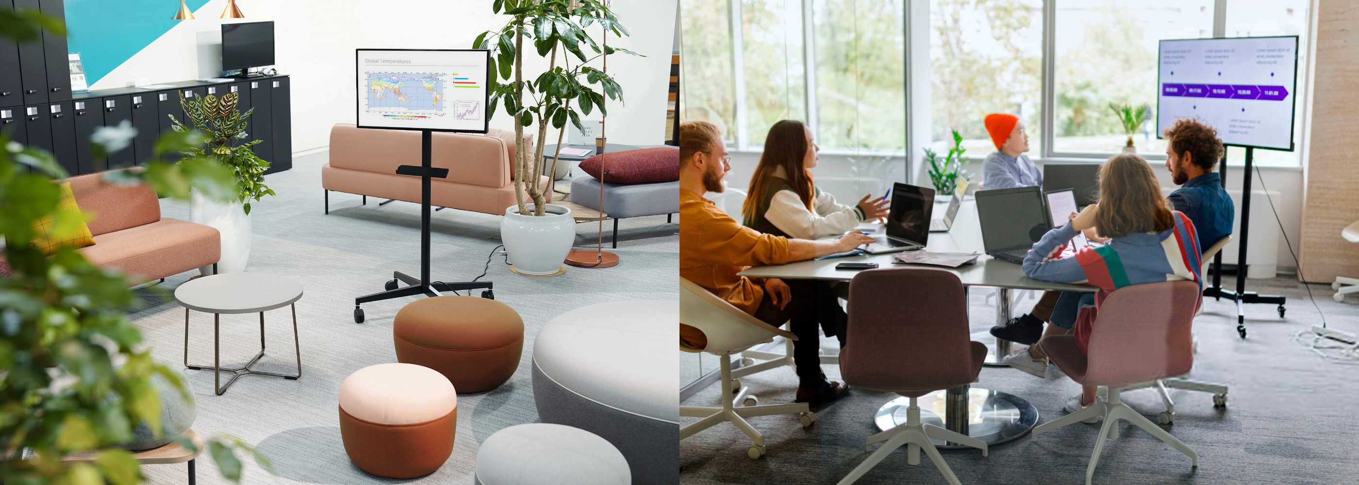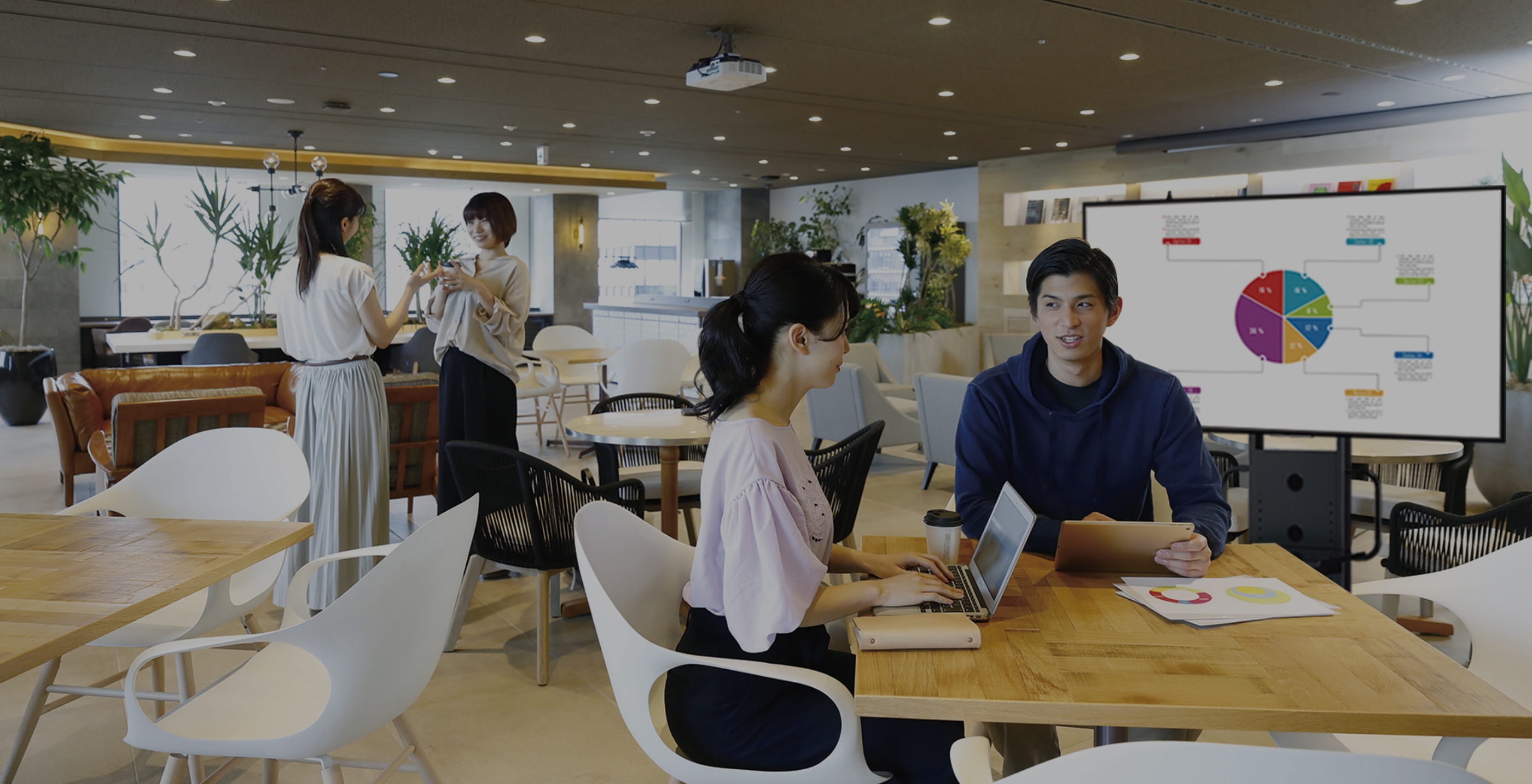 オフィス内のフリースペースやカフェスペースなどに、サイネージとしてブラビアを設置。配信したい映像を4Kの高画質で高精細に表示したり、ネットワークを通じたコンテンツマネジメントにも活用できます。また、移動式のディスプレイとの組み合わせで、場所を選ばず自由にレイアウトできるので、簡易的なミーティングにも使えます。