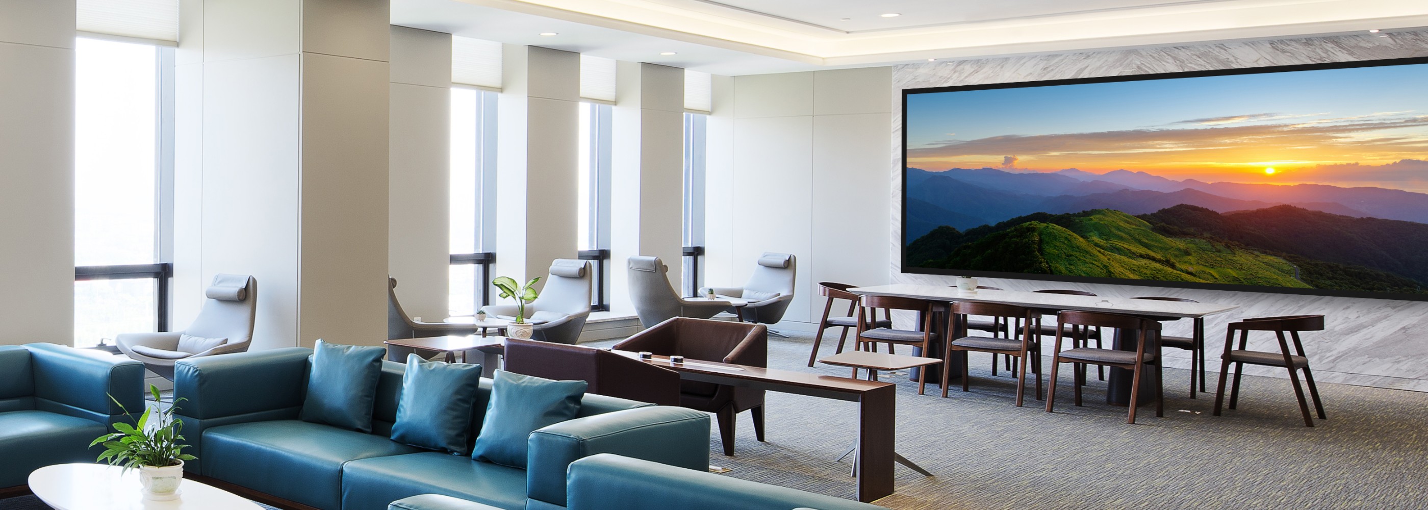 社員が一堂に会したり、顧客を招待する広いスペースにCrystal LEDを設置。懇親会や発表会などさまざまなイベントに活用することで、参加者同士のコミュニケーションの活性化や企業のイメージ戦略に寄与します。