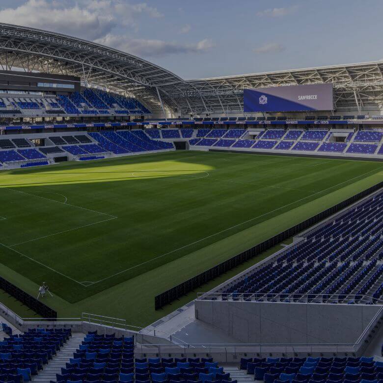 Jリーグ・サンフレッチェ広島の新たな本拠地となるサッカースタジアム『エディオンピースウイング広島』が、2024年2月に開業しました。日本初の “まちなかスタジアム” として、広島市中心部に誕生した新スタジアムは、すべての来場者へ超熱狂体験を提供するための映像装置・スタジアム音響・スタジアム照明(競技照明・演出照明(ムービングライト含む))などの設備を備えています。ソニーは、スタジアムの構想段階から設備部門のアドバイザーとしてプロジェクトに参画。映像と音響、照明が一体となったエンターテインメント空間を実現する統合演出システムの導入を担いました。