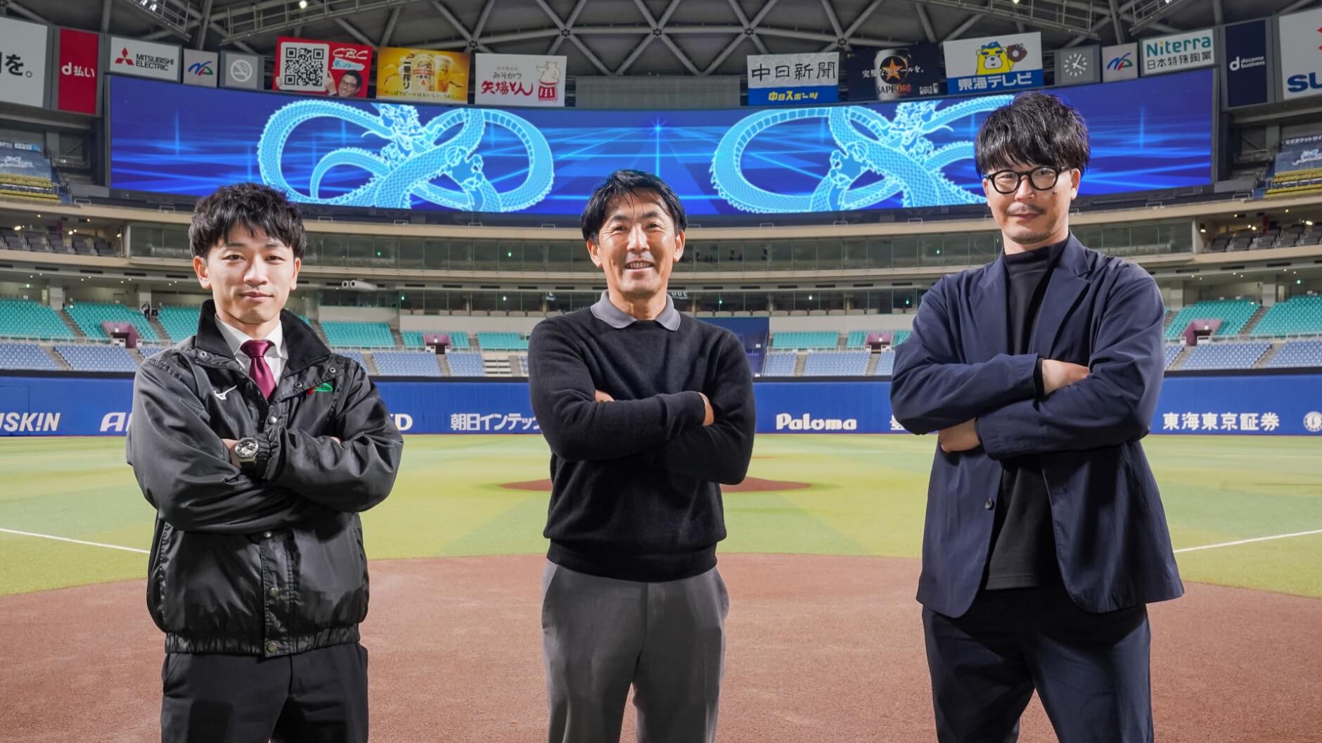写真左から、株式会社ナゴヤドーム 広告・映像部 服部 友彦 様、施設部 陣内 章良 様、企画・広報部 西脇 啓一郎 様