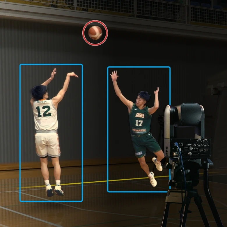 球技スポーツ(バスケットボール)の自動撮影が可能です。AIが 「コートエリア」「プレイヤー」「ボール」をリアルタイムで認識し、コードサイドからの俯瞰視点でフレーミングすることで、試合の流れを鮮明に捉えます。従来の被写体トラッキングとは異なり、高度なトラッキング技術の採用で、ボールの高速かつ不規則な動きにも対応し、常に最適なフレーミングを実現します。